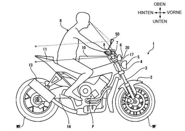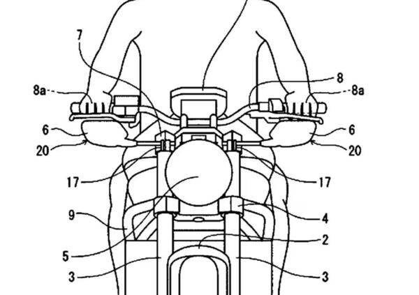 Il brevetto Honda prevede che gli specchietti siano montati direttamente sullo stelo della forcella sotto le piastre di sterzo anziché sopra di esse.