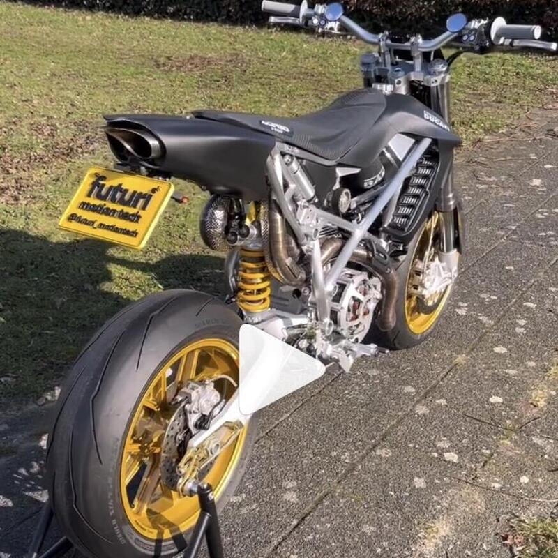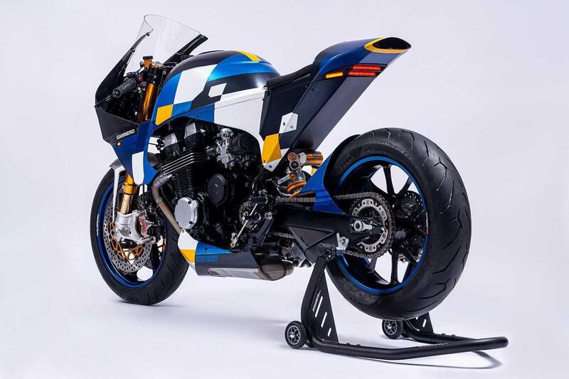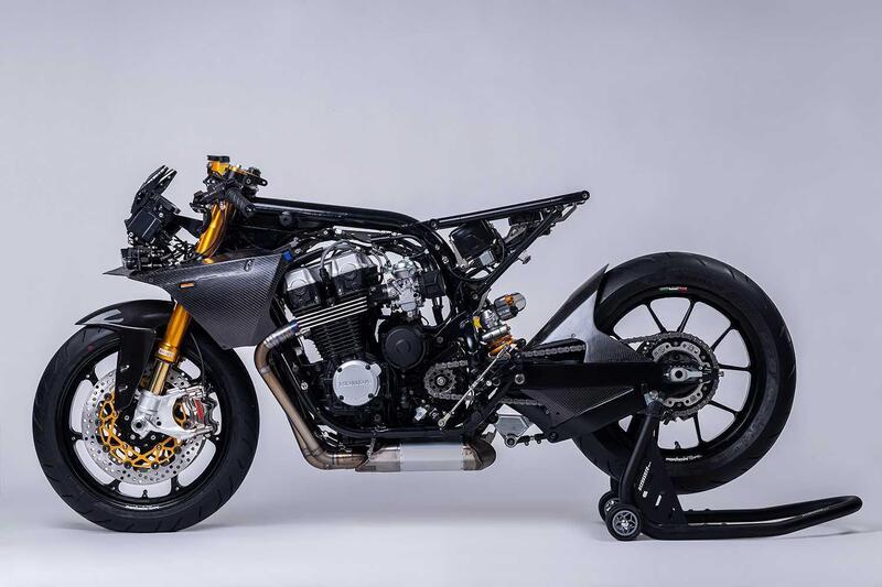 Ci sono poi cerchi in alluminio forgiato Marchesini con pneumatici Pirelli Diablo Rosso II. La frenata è affidata a pinze Brembo su entrambi gli assi: due unità ricavate dal pieno che stringono dischi da 320 mm all'anteriore, disco flottante alleggerito al posteriore. Il cockpit è dominato da un cruscotto digitale ECUMaster, affiancato da semimanubri con manopole e acceleratore Domino, leve Brembo e commutatori in stile racing.