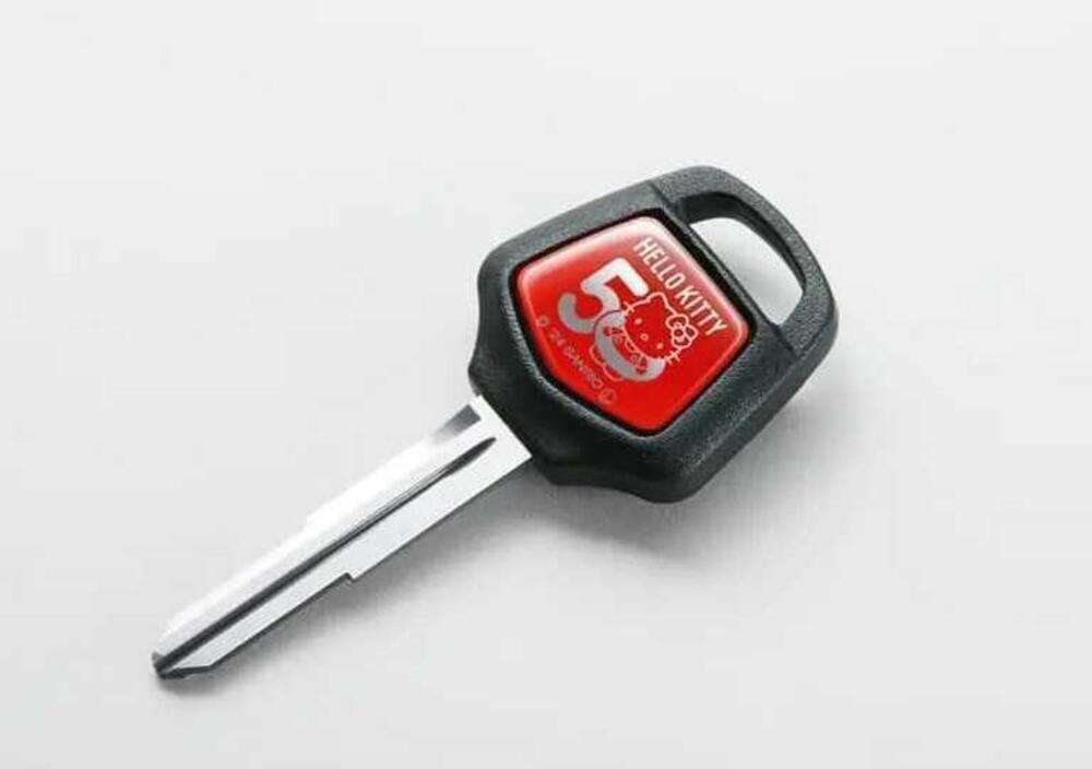 L'Honda Super Cub x Hello Kitty ha una livrea rossa con tantissimi dettagli in onore del cartone animato amato in tutto il mondo: i loghi con l'inconfondibile fiocchetto rosso, le cover laterali con la faccina della gattina, le stampe sulla sella e persino la chiave con il logo dei 50 anni!