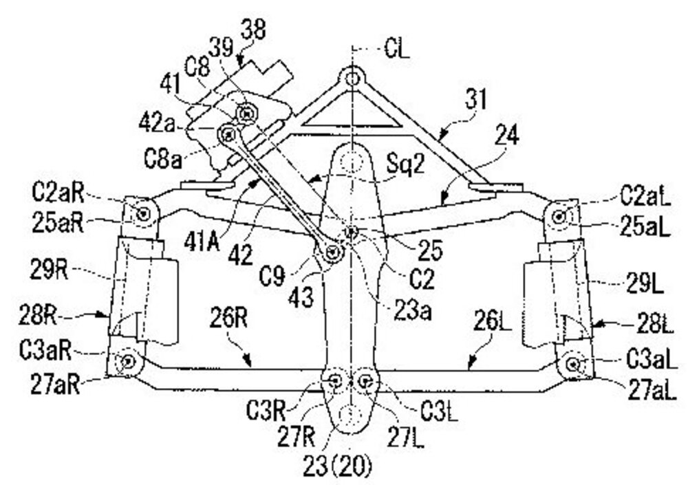 Lo schema delle sospensioni all’avantreno assomiglia tecnicamente ai parallelogrammi impiegati da Yamaha e Piaggio, rispetto ai quali però si notano diverse differenze in termini di scelte effettuate per i braccetti del parallelogramma. Analogamente a quelli, le sospensioni sono più interne rispetto alle ruote anteriori, ma con uno schema completamente diverso rispetto alle proposte della concorrenza.