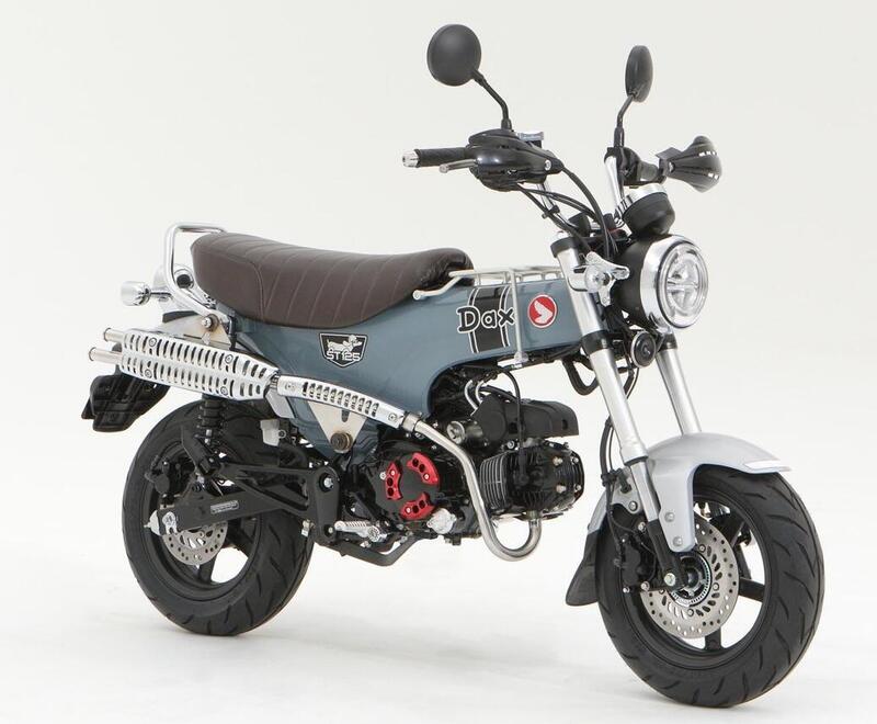 La seconda "special" su base Honda ST125 Dax in mostra a Osaka è invece destinata a una personalizzazione meno spinta e forse declinata in un contesto più urban: attraverso parti Kitaco cambiano il piccolo cupolino, gli specchi, ammortizzatori posteriori, traversino manubrio, tappi forcella e anche qui la possibilità di arricchire e rendere unico il proprio Dax è praticamente infinita.