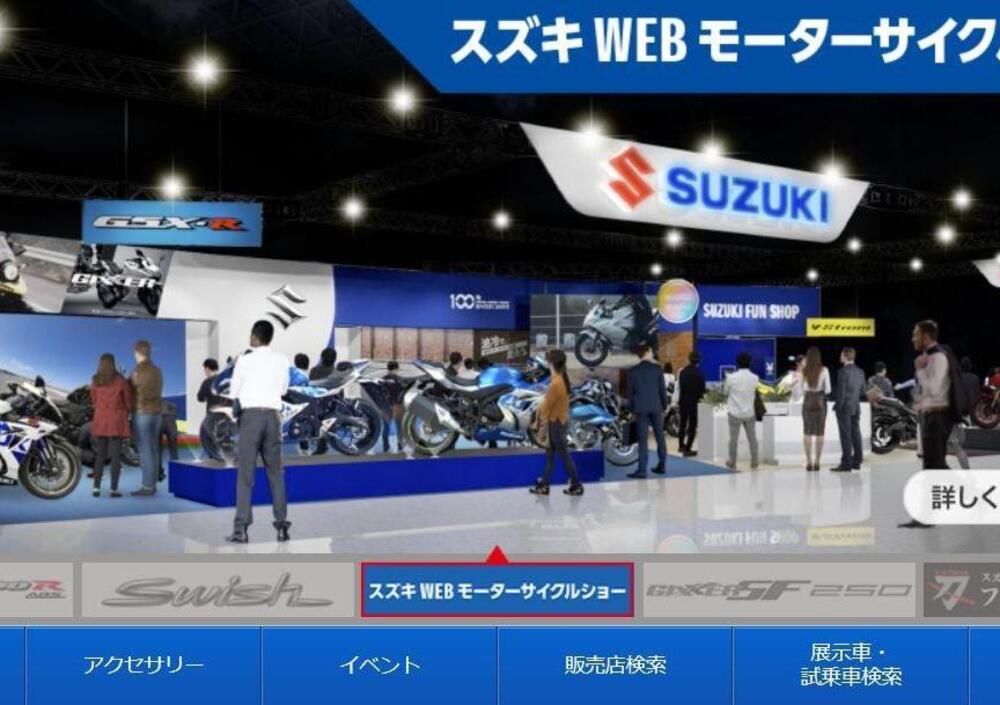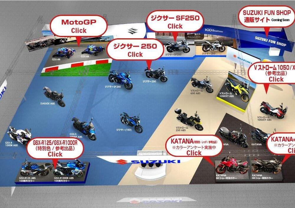 Suzuki ha scelto una strada totalmente virtuale, facendo cominciare il giro dello stand dalla classica pianta con i vari modelli cliccabili. Per ciascuno sono disponibili più video, emozionali e descrittivi, oltre a immagini e caratteristiche.