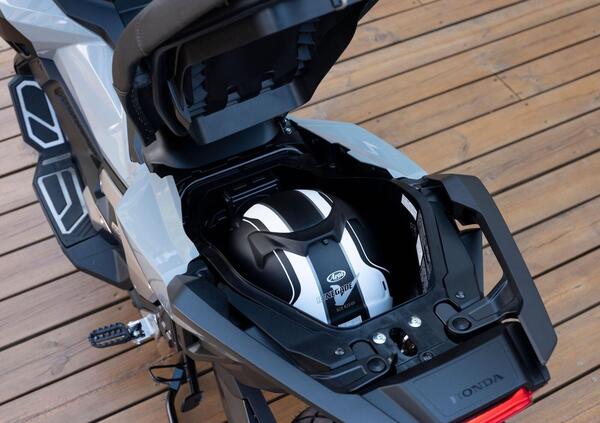 Il volume del vano sottosella è ora di 22 litri (+1 L), e come sempre può contenere un casco integrale – anche del tipo offroad, con frontino – più altri oggetti. Una luce di cortesia a LED assicura l’illuminazione interna del vano. Inoltre, è presente una presa di carica USB-C, che sostituisce la precedente 12V. Il freno di stazionamento è stato spostato dal retroscudo al lato destro del manubrio, liberando spazio per un pratico vano portaoggetti con serratura. Il cavalletto centrale è ora munito di sensore di inclinazione, per parcheggiare l’X-ADV in condizioni di pendenza senza il rischio di ribaltamenti.