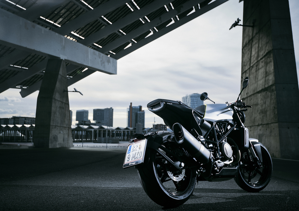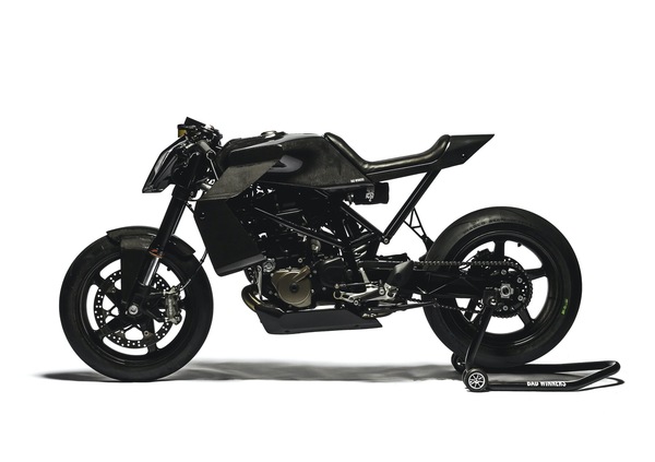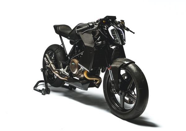 Le modifiche sono evidenti: tutte le sovrastrutture, ancora più spigolose e taglienti di quelle del modello originale, sono state realizzate in fibra di carbonio (il peso scende dai 157 kg del modello di serie a soli 130 kg) mentre all'anteriore il faro tondo della naked austro-svedese ha ceduto il posto all'unità originale della Duke 790. Il tema carbonio prosegue con i cerchi, una coppia di Dymag CA5 il cui peso complessivo non supera i 3 chili.