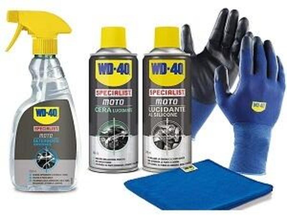 Sempre da WD-40 arriva un kit per la pulizia della moto, che include al suo interno tutti i prodotti essenziali per eliminare tutto lo sporco di carrozzerie. In particolare, il kit in questione contiene un WD-40 specialist moto detergente da 500 ml, un WD-40 specialist moto cera lucidante da 400 ml, un WD-40 specialist moto lucidante al silicone da 400 ml, un paio di guanti di precisione WD-40 e un panno in microfibra WD-40. Tutto questo si traduce in 29,08 euro! Un prezzo decisamente allettante vista la bontà dei prodotti contenuti nel kit.
