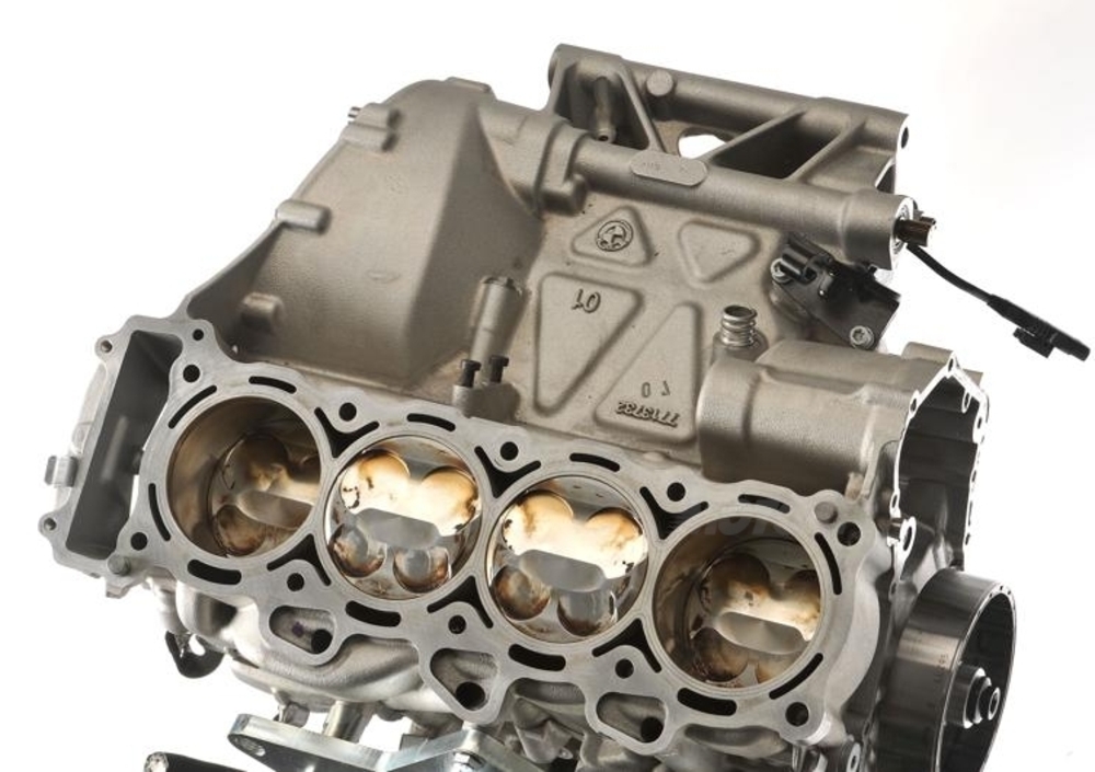 Il cuore della ciclistica è composto dal telaio a doppia trave in alluminio composto dall’unione di quattro elementi stampati del peso di solo 11,98 chilogrammi che accoglie il motore inclinato in avanti di 32 gradi come elemento portante.