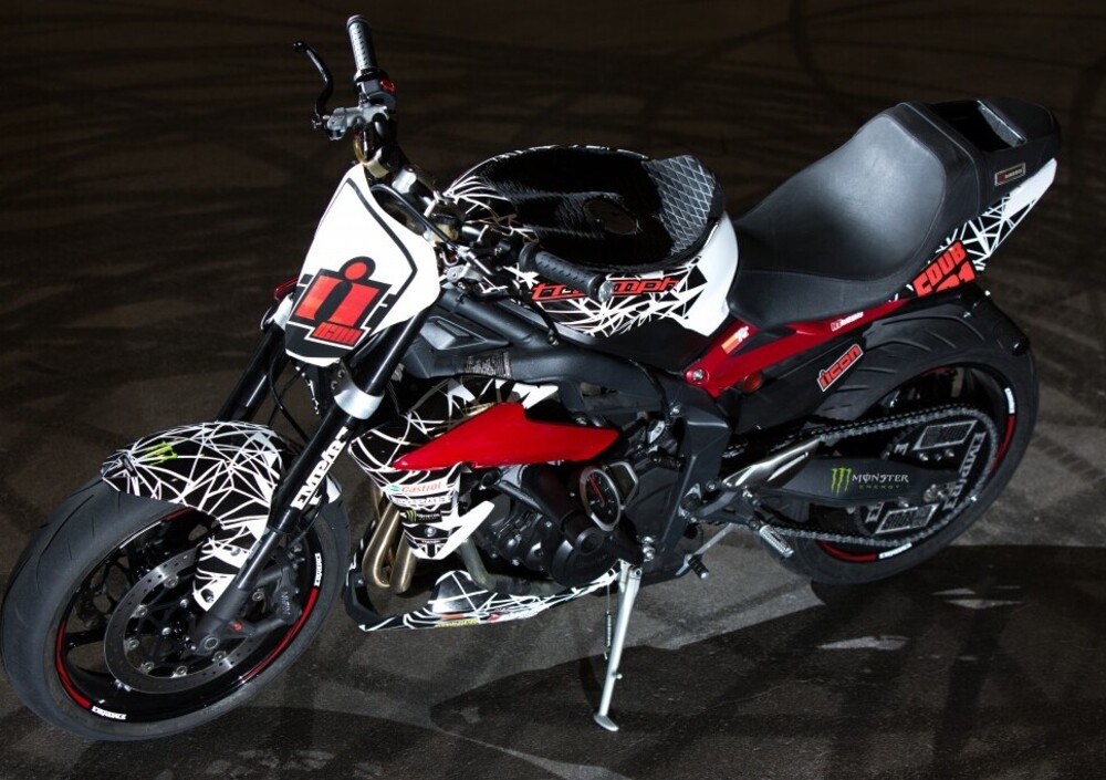 Questa volta per il 2015 ICON rifà il look a due bellissime Street Triple. La formula è sempre la stessa: grafiche aggressive e curate nei particolari, colori sgargianti e tutto il kit necessario per trasformare le due naked inglesi in perfette moto da stunt. Il lato estetico non è stato l'unico aspetto ad essere curato, ma anche quello prestazionale ha beneficiato di qualche cambiamento. Nuova centralina Dynojet, filtro K&N, impianto frenante rivisto, corona maggiorata per facilitare le impennate quasi da fermo e nuovi pneumatici Avon. Infine il cruscotto è stato spostato dal suo alloggiamento abituale e "incastonato" all'altezza del motore sul lato sinistro della moto. Esteticamente queste due inglesine, se commercializzate, potrebbero far la felicità di molti giovani bikers.