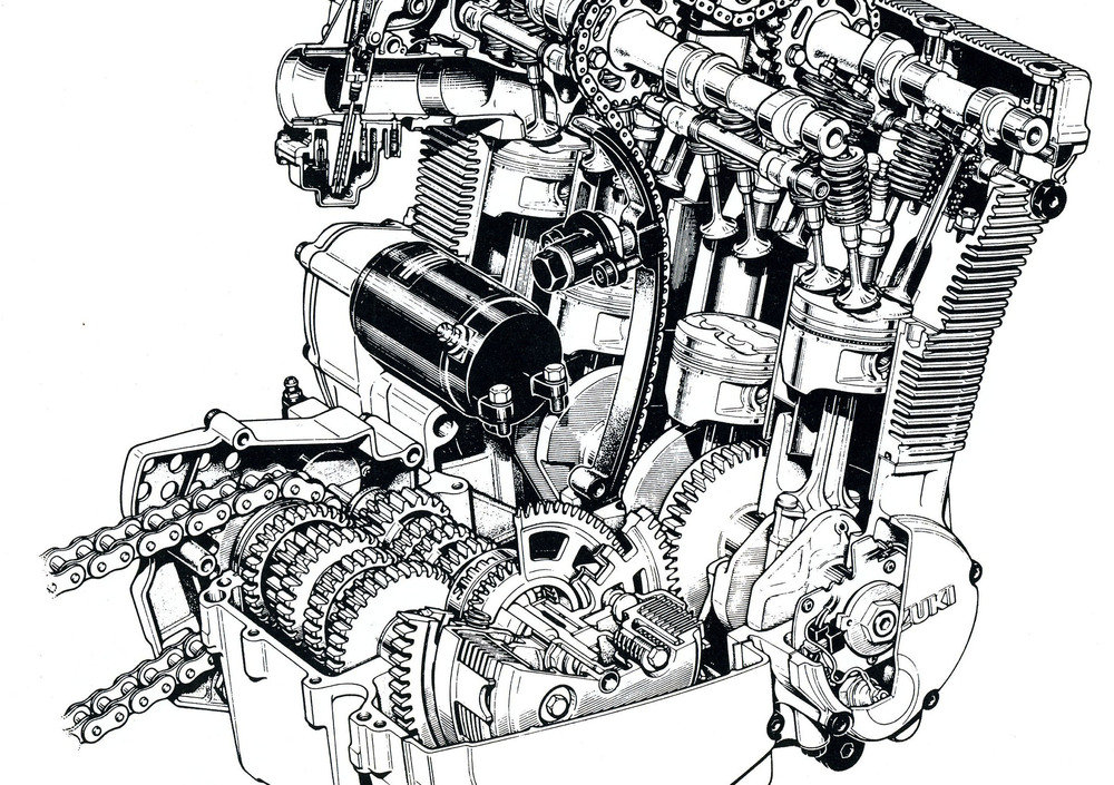 Nei motori con quattro cilindri in linea si è lavorato anche per ridurre l’ingombro trasversale (o per poter adottare alesaggi maggiori senza aumentare la larghezza). Questo è stato possibile cambiando la posizione della catena di distribuzione, che da centrale è diventata laterale. I supporti di banco, che in precedenza spesso erano sei, sono diventati invariabilmente cinque e l’albero a gomiti è diventato più corto e rigido. Un ulteriore vantaggio si è avuto passando dalle canne riportate in ghisa a quelle integrali con riporto al nichel-carburo di silicio. Oltre a un minor peso e a un più agevole passaggio del calore, questo ha consentito anche di ridurre l’interasse tra le canne dei cilindri, per un dato alesaggio. In altre parole, è diminuito lo spessore della parete metallica che separa le canne adiacenti, cosa vantaggiosa ai fini della compattezza. Nei quadricilindrici in linea degli anni Ottanta erano usuali valori dell’ordine di 12-18 mm. Una forte riduzione si è avuta nel decennio successivo. Passando dalla versione del 1995 a quella del 1996 nel motore Suzuki GSX-R 750, grazie alla adozione della catena di distribuzione laterale e di canne integrali con riporto superficiale, lo spessore di tale parete è sceso da 15 a 8 mm. Tra la fine degli anni Novanta e l’inizio degli anni Duemila si è arrivati ai valori attuali (che per i 1000 a 4 cilindri supersportivi sono compresi tra 6 e 5 mm soltanto!).