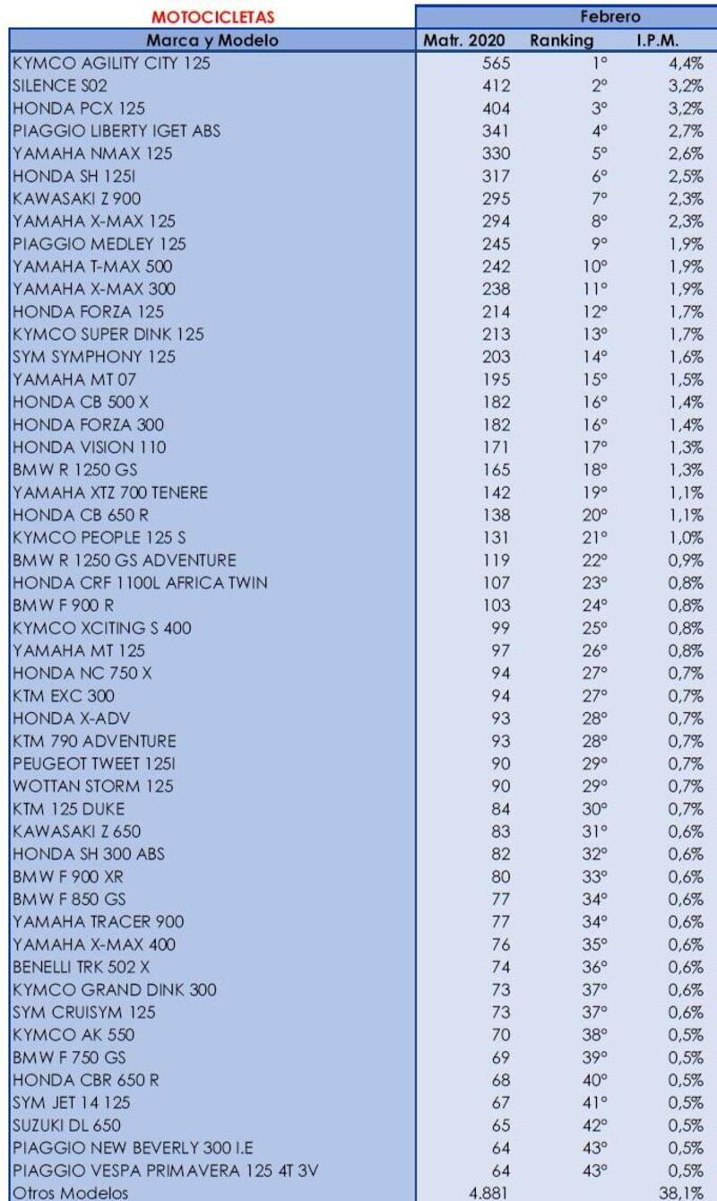 Le altre moto che seguono nei primi posti (qui sotto la classifica completa) sono : Yamaha MT-07 (195), Honda CB500X (182), BMW R1250GS (165), Yamaha Ténéré 700 (142), Honda CB650R (138), BMW R1250GS Adventure (119), Honda Africa Twin (107), BMW F900R (103), Yamaha MT-125 (97), Honda NX750X (94), KTM EXC300 (94) e KTM 790 Adventure (93).