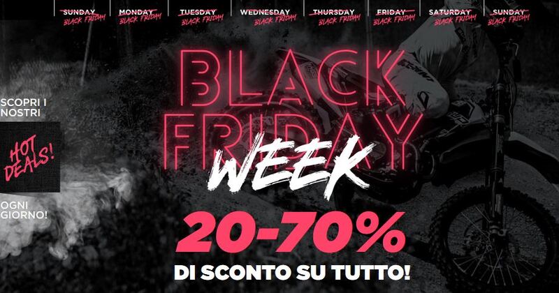Ogni giorno, per tutta la settimana del Balck Friday, tantissime offerte dedicate al mondo del fuoristrada su 24mx.it: sconti dal 20 fino addirittura al 70% da tenere d'occhio e di cui appofittare se amate il motocross, l'enduro o il trial.