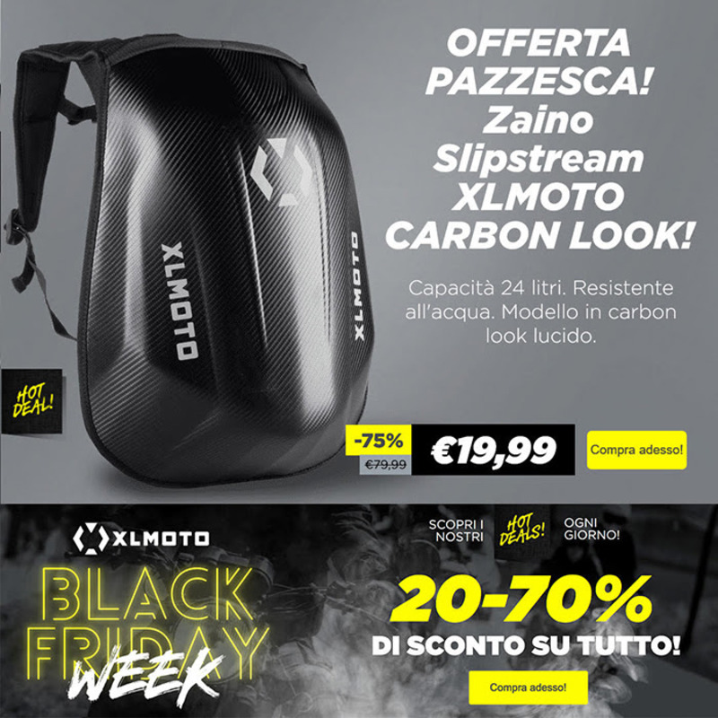 Anche su XLmoto.it fioccano sconti dal 20 al 70% da scegliere tra un'infinità di proposte, come ad esempio quell dedicata allo zaino Slipstream acquistabile a 19,99 euro anziché 79,99: lo sconto arriva fino al 75%!