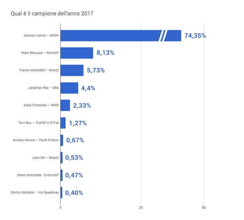 Non è stato quindi un caso se il sondaggio che abbiamo lanciato a fine dicembre sul “Campione del 2017” ha visto due italiani sul podio. I lettori di Moto.it hanno infatti espresso una preferenza plebiscitaria a Toni Cairoli: il nove volte campione del mondo ha ottenuto il 74.35% delle preferenze, ovvero tre voti su quattro. Ricordiamo che Cairoli era stato già premiato da Moto.it come sportivo dell'anno.