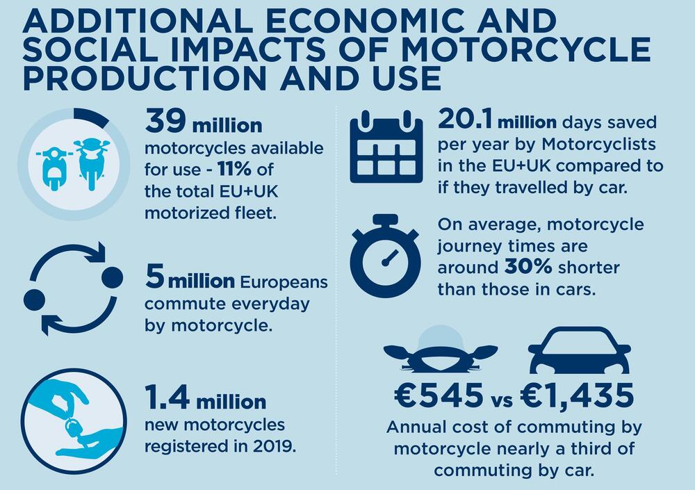 I conti li ha fatti una nuova ricerca dell'inglese Oxford Economics, illustrando come il settore motociclistico nell'Unione Europea, più Regno Unito, ha creato 389.000 posti di lavoro fra produzione di veicoli, di parti e accessori, di abbigliamento e di dispositivi di protezione, nonché per le attività legate ai motocicli come la vendita, la riparazione e così via.