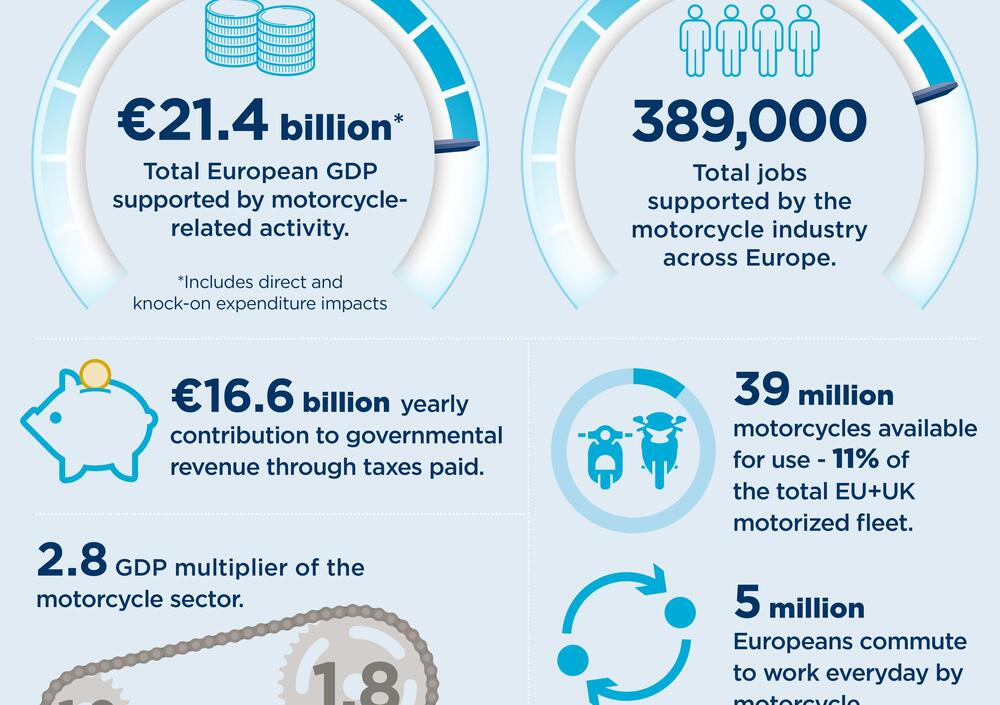 Lo studio ha calcolato che nel 2019 il settore motociclistico ha contribuito per circa 21,4 miliardi di euro al PIL dell'Europa. Inoltre ogni euro di PIL creato direttamente dalle imprese motociclistiche ne ha generato 1,8 in altri settori (con un fattore moltiplicatore 2,8), a causa degli impatti di spesa conseguenti.