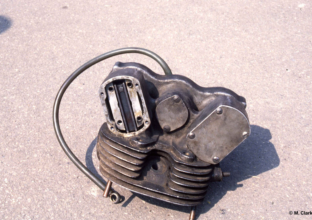 Di recente però ho avuto un colpo di fortuna ancora maggiore, che merita senz’altro due parole. La straordinaria collezione di quella autentica enciclopedia del cross che è Gian Pio Ottone comprende oltre duecento splendide moto da fuoristrada, alcune delle quali vittoriose nei campionati mondiali. Ci sono anche tre ESO. Ne avevo già fotografate due con motore ad aste e bilancieri ma ce ne era una terza con una testa dalla strana conformazione. Anzi, era dotata di una vera e propria scatola di alluminio (ovvero di un “castello”, come talvolta dicono i tecnici) piazzata subito sopra la testa vera e propria, la cui parte superiore era stata opportunamente fresata. Si imponeva un’occhiata e, così qualche giorno fa si è provveduto alla rimozione del coperchio per osservare gli organi interni. La sorpresa è stata straordinaria. Questo motore ha una distribuzione desmodromica, realizzata con uno schema assolutamente unico. Pure in questo caso si tratta di un sistema a slitta, ma l’albero a camme (diviso in due parti vincolate una all’altra a livello dell’ingranaggio centrale) è disposto longitudinalmente e non trasversalmente. In altre parole, ha l’asse di rotazione non parallelo ma perpendicolare a quello dell’albero a gomito!