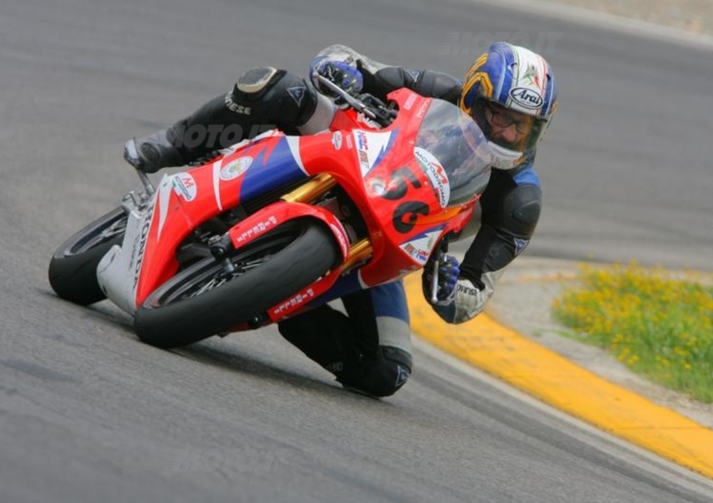 Bisognerebbe innanzitutto spiegargli che la strada da casa sua al Motodromo di Castelletto di Branduzzo è sempre la stessa. Ogni volta riesce a fare un giro diverso. «Domani vengo direttamente in moto – mi ha detto il giorno prima del corso – così arrivo prima». Risultato: si è presentato un minuto dopo l’inizio della lezione! Ma il Piro è il Piro. Lui ha il compito di portarsi dietro gli allievi più indiavolati, perché, avrà pure 50 anni suonati, ma è instancabile. Fisico perfetto, giura di essere ancora in grado di indossare la sua tuta del 1988, massacra gli allievi più giovani, li fa andare via in ginocchio per la stanchezza… Gira con le 4 “frecce” lampeggianti, il clacson che strombazza ad ogni passaggio se c’è anche solo una persona a guardarlo. Il peggio lo riserva a fine giornata: prima gli scappa un bourn out, nel passaggio paddock-pista; poi “mette in piedi” la moto per tutto il rettilineo.