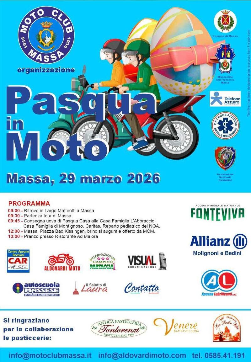 L'evento del 29 marzo Seguendo questa strada vincente, il Moto Club Massa invita tutti i motociclisti, gli scooteristi e gli appassionati (inclusi i proprietari di auto d'epoca) a partecipare alla V edizione di "Pasqua in moto". L'obiettivo dell'evento è consegnare le uova di cioccolato, offerte dal main sponsor Apuana Lubrificanti, ai bambini ospiti delle Case Famiglia cittadine e ai pazienti dei reparti di Pediatria e Oncologia dell'Ospedale NOA.