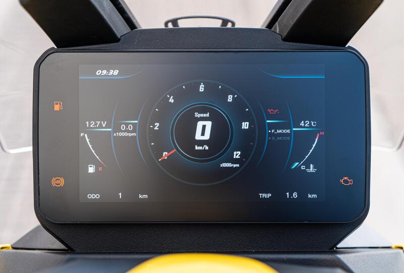 Di rilievo la dotazione dove spiccano l'ampio dashboard TFT da 7 pollici, dotato di connettività bluetooth che offre la possibilità di visualizzare e gestire le chiamate del proprio smartphone, i fari FULL LED e l'avviamento keyless di serie, mentre la ciclistica è affidata a un telaio in acciaio con interasse di 1.600 mm accoppiato a una forcella a steli tradizionali del diametro di 37 mm all'avantreno e a una coppia di ammortizzatori al posteriore. 260 e 220 mm sono rispettivamente i diamentri dei dischi freno anteriore e posteriore, assistiti da ABS nella versione "+" dello Storm-V e da CBS (frenata combinata) nella versione standard.