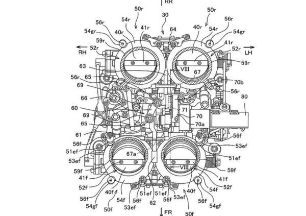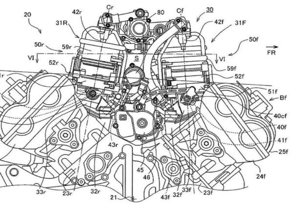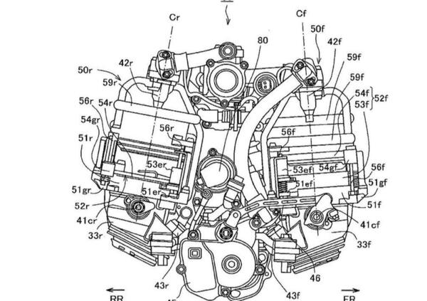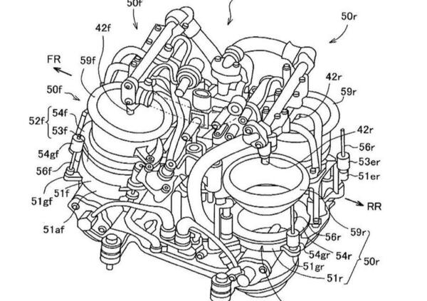 Ora sappiamo bene che il veicolo su cui è montato il motore oggetto del brevetto è puramente indicativo, e potrebbe essere anche volutamente fuorviante. Ma resta il fatto che questa soluzione si presta al migliore sfruttamento delle prestazioni in chiave sportiva e quindi la moto del tutto simile a una RC213V, ma dotata di impianto luci, fa subito drizzare le antenne.
