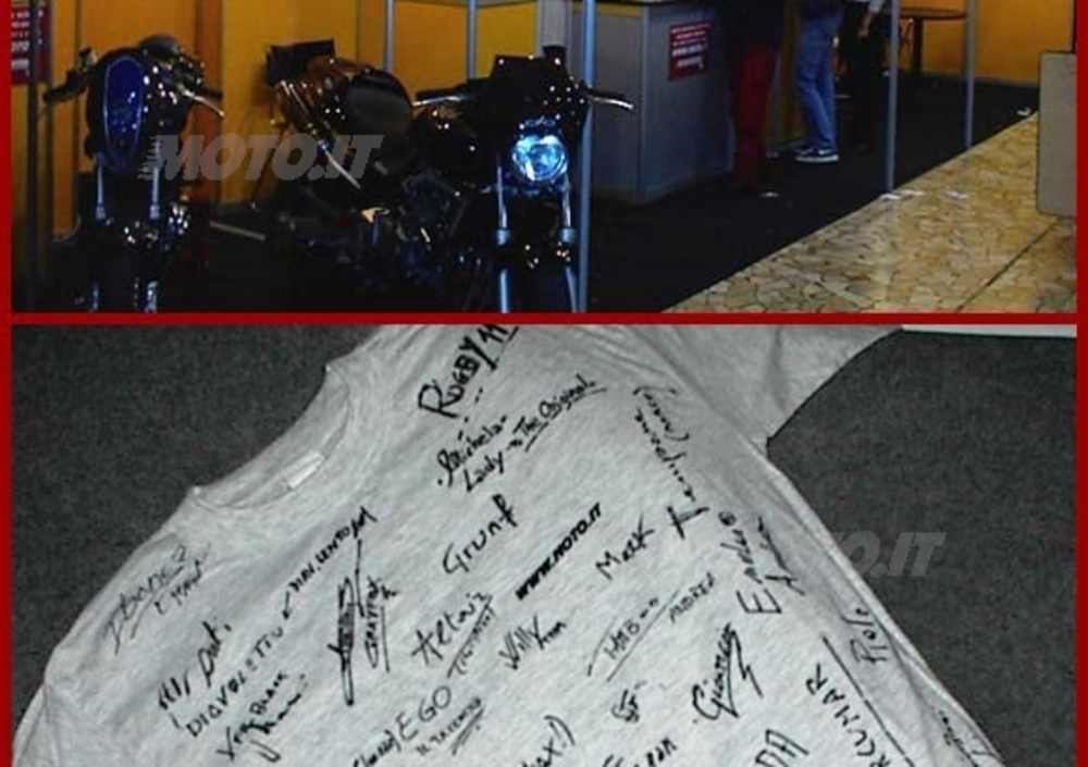 Immagine dello stand di Moto.it alla Fiera di Milano e della "mitica maglietta" con le firme del Forum.