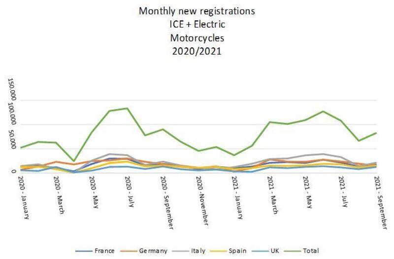 E' quanto emerge dai dati diffusi dalla ACEM (l'associazione europea dei costruttori del settore motociclistico) a proposito del periodo gennaio-settembre 2021 e che vedono le vendite di Francia, Germania, Italia, Regno Unito e Spagna a quota 792.819 unità. Significa un aumento del 10,6% rispetto allo stesso periodo dell'anno scorso, anno complicato per effetto della pandemia, ma che si chiuse comunque con un lieve incremento rispetto al 2019 e sempre per quanto riguarda la somma dei cinque mercati di riferimento.
