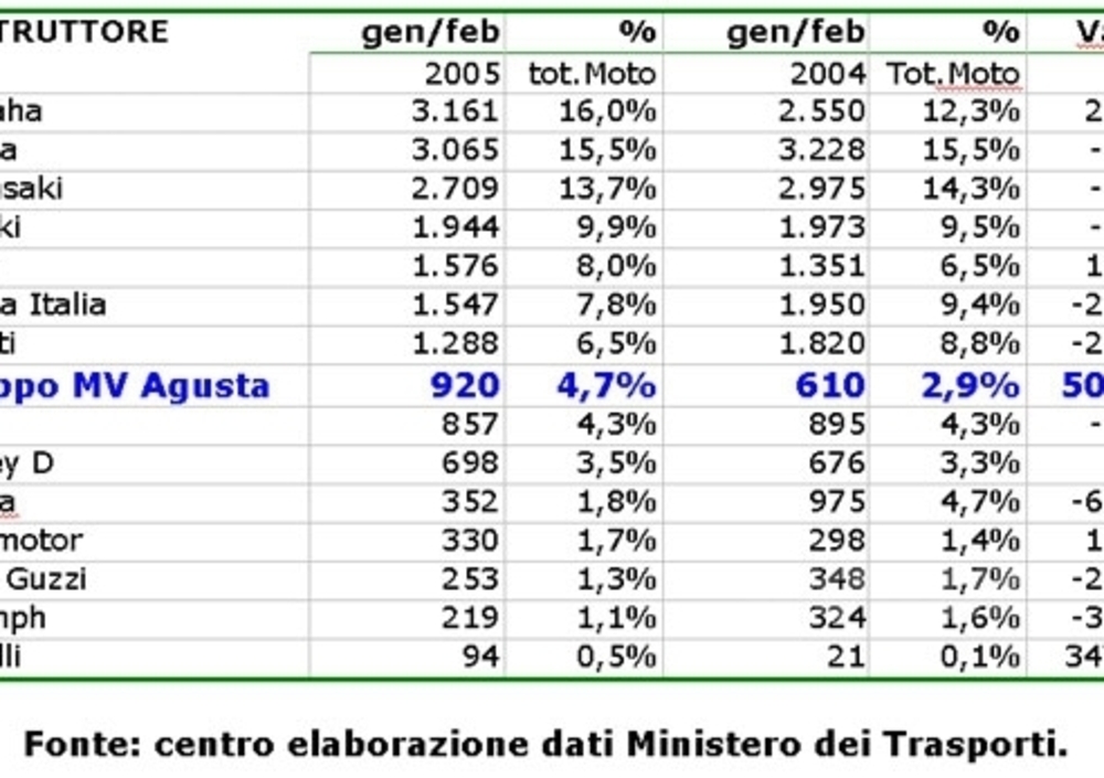 Varese 15 marzo ’05: Con 920 moto immatricolate il gruppo MV Agusta chiude il primo bimestre ‘05 con un incremento delle vendite del 50.8% rispetto allo stesso periodo 2004. Nel dettaglio i volumi sono ripartiti in 439 unità Husqvarna, 305 MV Agusta e 176 Cagiva mentre la classifica per modello vede sempre al comando la MV Agusta Brutale con 186 unità seguita dalla Cagiva Mito e dalla Husqvarna SM125S che hanno totalizzato rispettivamente 142 e 139 pezzi. Ottima anche la performance della F41000S che con 101 unità entro nella top 100 dei modelli più venduti. Questi numeri consentono alla casa varesina di conquistare il 4,7% del mercato nazionale, la più alta quota di penetrazione degli ultimi cinque anni.