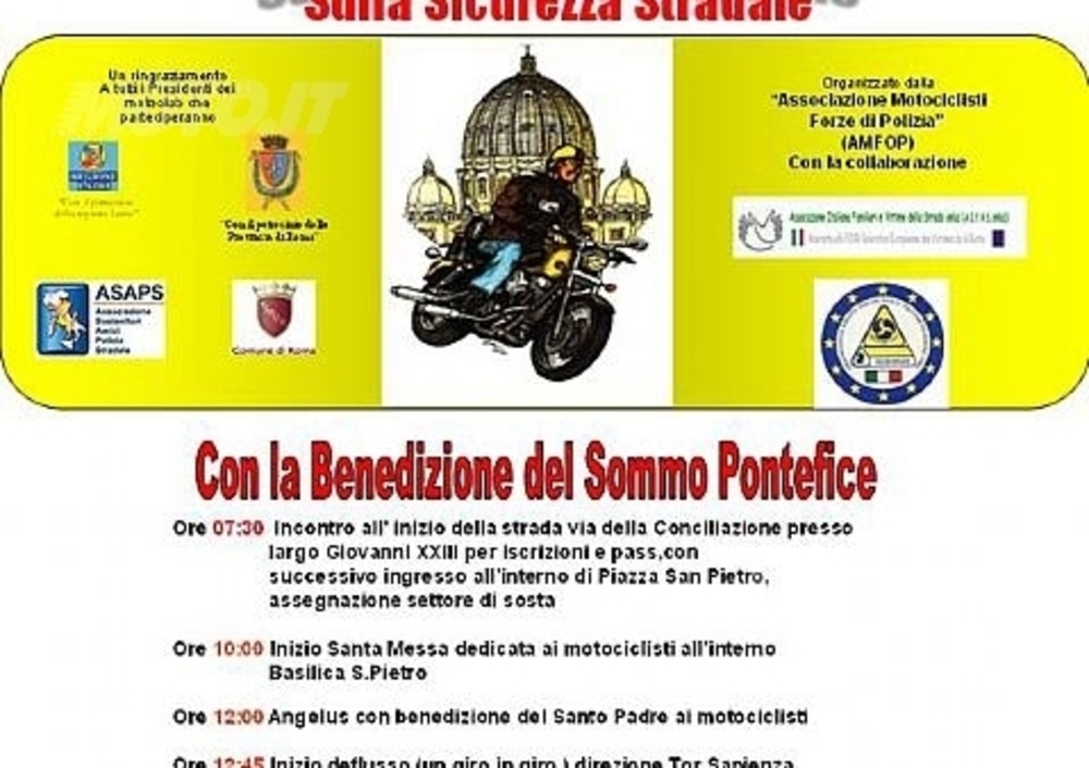 Per l'AMFOP è il secondo appuntamento con Benedetto XVI, ed il successo di quella prima edizione della manifestazione "Due ruote in Vaticano" ha varcato le alpi, cosi domenica 25 maggio sul sagrato di piazza San Pietro ci saranno altre associazioni motociclistiche anche dall'estero (Francia, Spagna, Svizzera, Germania, ed altri paesi).