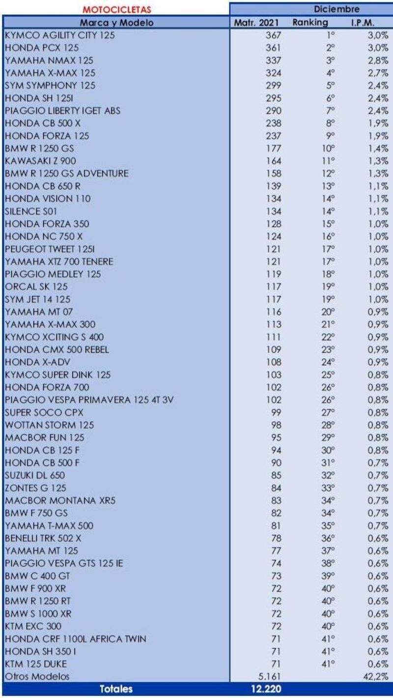 N.B. Le tabelle qui sotto indicano le classifiche dei cinquanta modelli più venduti, sempre oltre i 50 cc, nel mese di dicembre e poi nel 2021 completo.