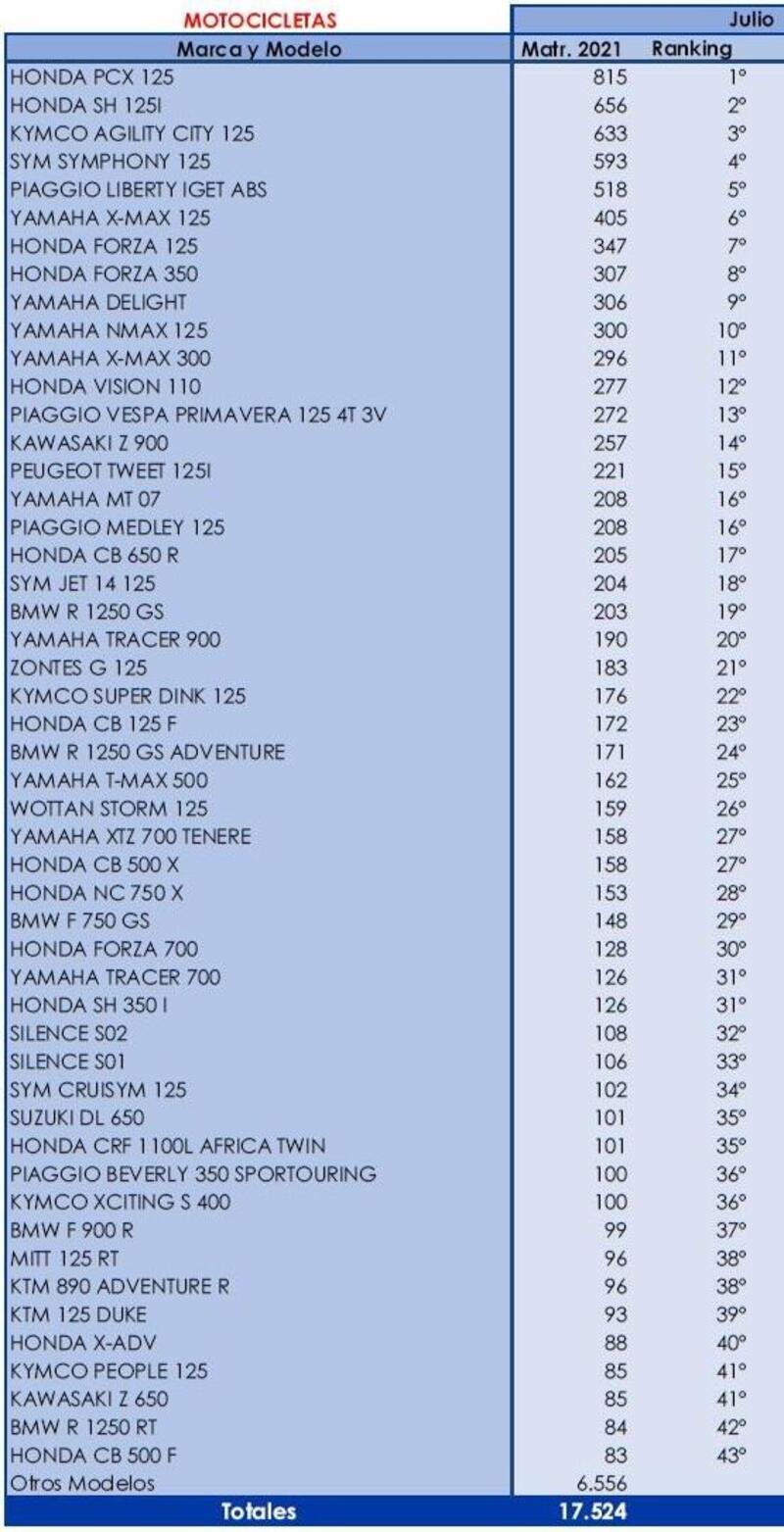 La classifica dei modelli più venduti nel mese di luglio vede nelle prime tredici posizioni altrettanti scooter e di questi ben undici sono della classe 125, cilindrata che occupa le prime sette posizioni e vede in testa i modelli Honda PCX e SH. Scende al decimo posto mensile lo scooter Yamaha NMAX che con 3.595 unità è in testa alle vendite assolute dei primi sette mesi di quest'anno.