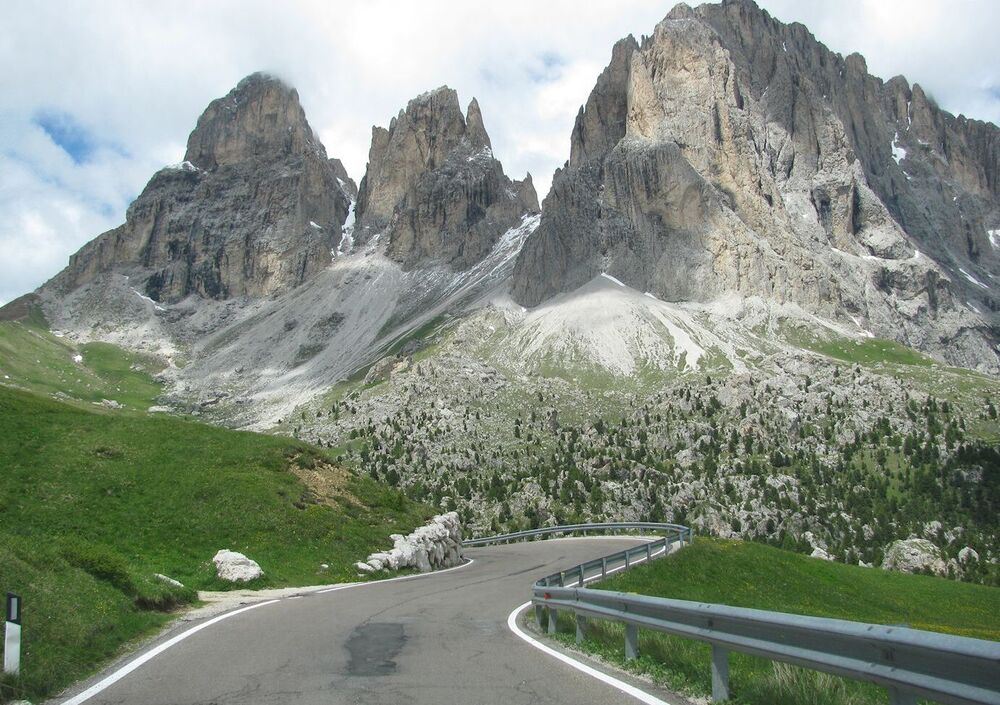 Il meglio, il divertente, quello che insomma fa impazzire gli amanti delle due ruote incomincia con la salita verso passo Sella. Le curve si trasformano in tornanti, il manto stradale tiene bene e consente di staccare e scalare all’ultimo senza timore di scivolare. A fare da contorno ci sono i colori: il blu del cielo, l’azzurro dei laghi alpini, il verde della fitta vegetazione e il grigio bianco, marmoreo in certi punti, delle Dolomiti. La discesa verso Canazei è quasi frenetica tanto è un continuo danzare a destra e a sinistra mentre sullo sfondo si fanno più lontani il Sasso Lungo e il Sasso Piatto. In certi punti gli incontri con le moto che salgono nella direzione opposta sono pericolosi perché i tornanti sono stretti e lo spazio di manovra è scarso.