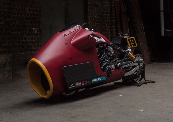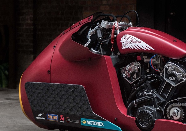 La Scout Bobber è stata modificata installando una (splendida) carenatura a campana, un serbatoio benzina modificato - più stretto e dalla capienza di soli 2,5 litri, più che sufficienti per un lancio - e un forcellone allungato, per aumentare la trazione e ridurre la tendenza all’impennata.