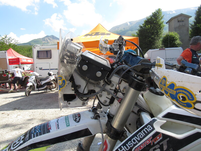 Presenza fissa al paddock lo stand della MST che tra l’altro è anche sponsor del Motorally. La ditta di Reggio Emilia è molto attiva, da qualche anno, nella nostra disciplina con la produzione di parti speciali per migliorare la navigazione. In questa occasione Gianluca Calò, uno dei responsabili della Casa, ha presentato il nuovo sistema di dente di aggancio per il telaietto porta strumenti. Questa evoluzione permette di agganciarsi al telaio sfruttando le sedi dei cuscinetti di sterzo senza perciò intervenire con fori o saldature. Il marchingegno viene ricavato dal pieno con il CNC ed offre un ancoraggio molto robusto e stabile. Supportando la strumentazione in questo modo, cioè togliendo il peso che prima gravava sulla forcella, la moto diventa molto più maneggevole e viene agevolata anche la lettura degli strumenti di navigazione.