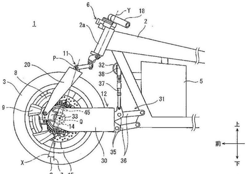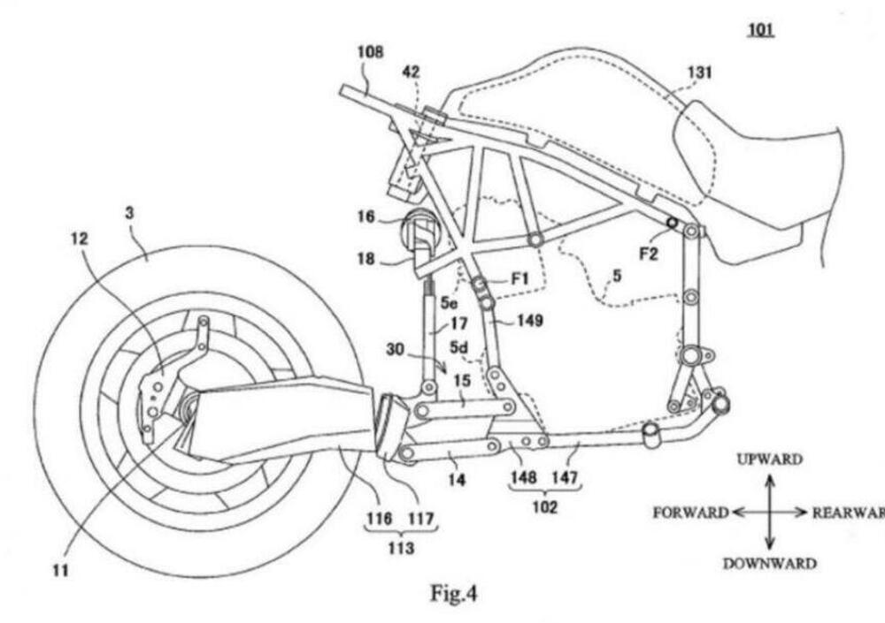 La soluzione mostrata nei disegni di brevetto è concettualmente molto vicina a un altro brevetto depositato - sempre da Kawasaki -nel 2017 (vedi qui sotto dopo la prima immagine, ci sono poi i disegni di un altro brevetto che risale al 2015, ma con forcellone bibraccio) e concerne un sistema basato su monobraccio anteriore, mozzo sterzante con freno a disco singolo, comando di sterzo meccanico e ammortizzatore montato orizzontalmente dietro alla ruota anteriore, e azionato tramite leveraggi.