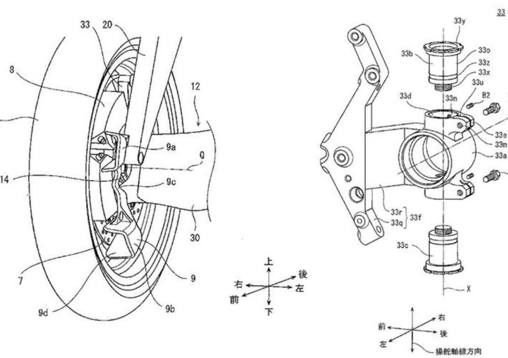 E così, dopo la stravagante idea dello sterzo “disarticolato” proposta da Kawasaki, l’ultimo brevetto in ordine di tempo che riguarda una sospensione anteriore dotata di sistema sterzante nel mozzo si deve quindi alla stessa Casa di Akashi, e a darne notizia è il sito britannico BikeSocial.
