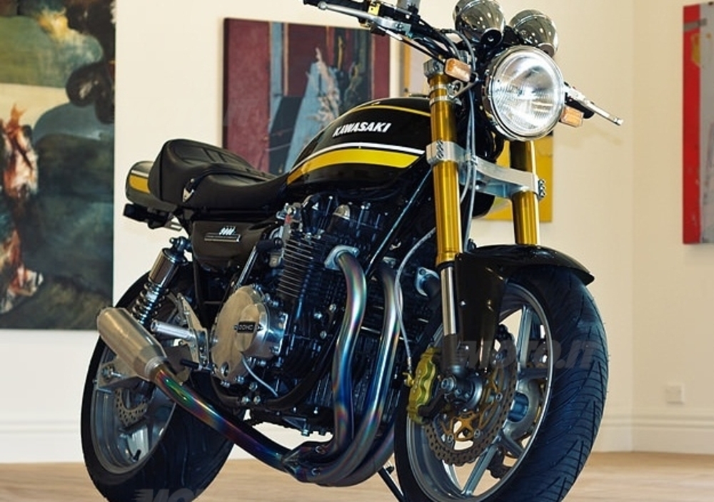 L'idea che sta dietro alla preparazione di questa Kawasaki - scelta per l'impatto prestazionale e tecnico che ha avuto a suo tempo, ridefinendo diversi riferimenti della categoria - è appunto un matrimonio fra un grande classico e componentistica moderna dove serve partendo, com'è evidente dalle foto, all'avantreno. Prelevato in toto da una ZX-10R, il gruppo forcella/freni è stato allungato di 50mm ed inserito in nuove piastre per mantenere la geometria di sterzo originale. Il serbatoio è stato spostato leggermente all'indietro per accogliere il nuovo avantreno, dotato di manubrio e comandi completamente nuovi.
