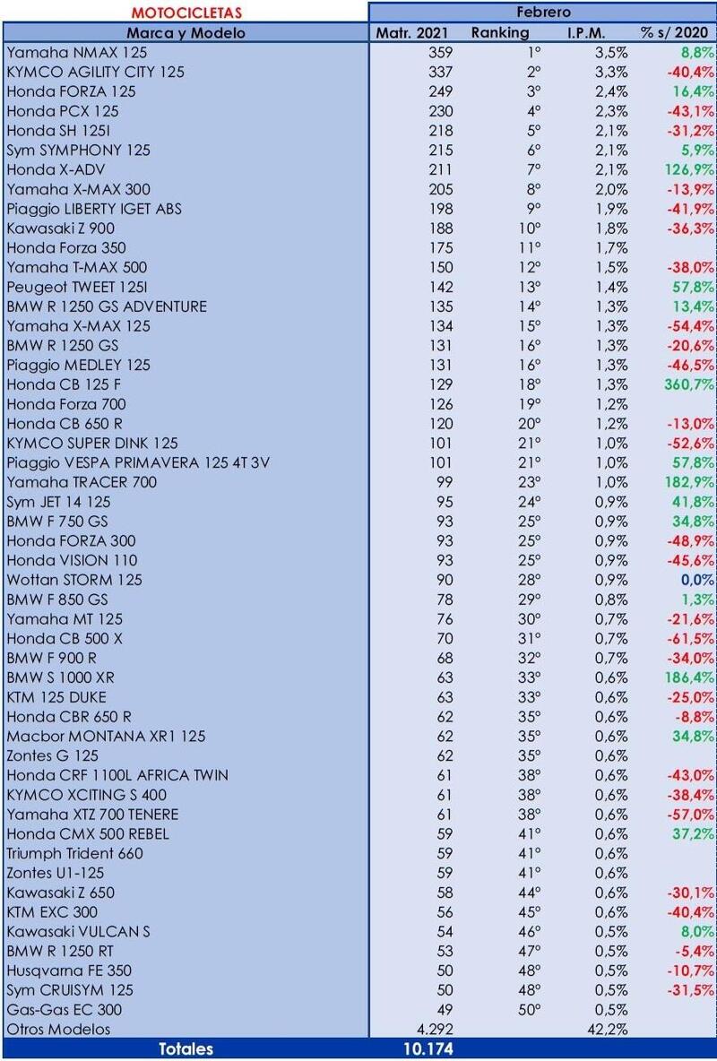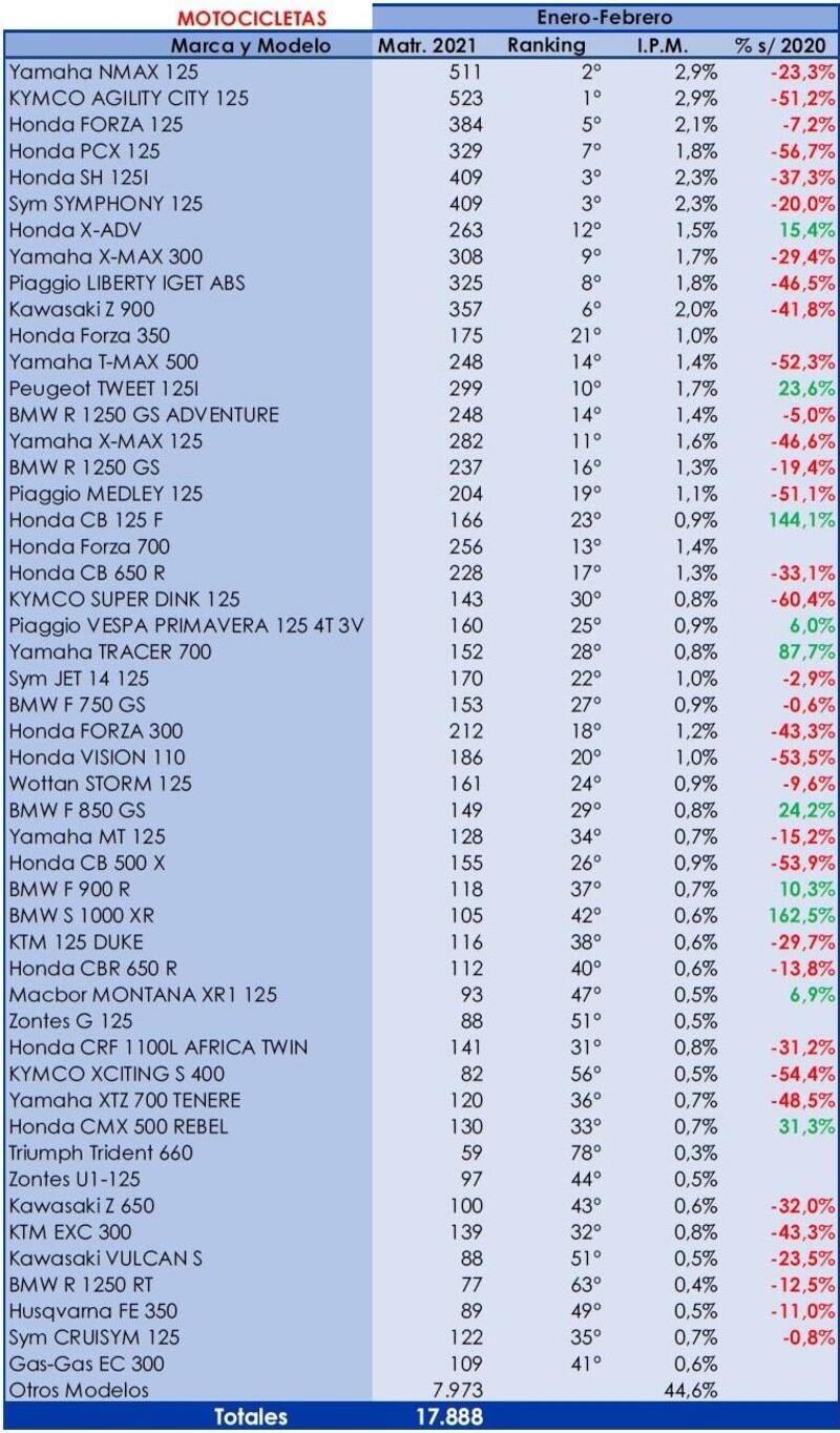 Fra i 50 modelli più venduti, le prime sei posizioni sono occupate da scooter 125 (Yamaha NMAX è primo), poi l'Honda X-ADV 750, l'X-MAX 300 Yamaha, il Piaggio Liberty 125 e finalmente – in decima posizione – la prima moto: Kawasaki Z900 (188 unità) che è stata anche la più venduta nell'intero 2020. Seguono al 14° e 16° posto rispettivamente le BMW R 1250 GS Adventure e R 1250 GS standard.