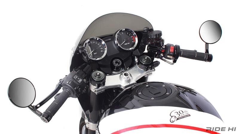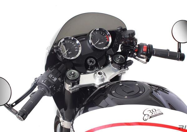 I semimanubri e il cupolino sono le parti che immediatamente colpiscono, ma poi ci sono anche altri accorgimenti che oltre che estetici sono anche funzionali. Come ad esempio la sella che dona un aspetto un po' café racer e al contempo che alza la posizione di guida di un paio di centimetri. Le ruote passano dai raggi dell'originale alle razze dei cerchi in alluminio forgiato. Il forcellone standard è stato sostituito da uno in alluminio con particolari doti di rigidità per aumentare il feeling al posteriore. Anche l'ammortizzatore è stato cambiato con un mono Hyper Pro completamente regolabile.
