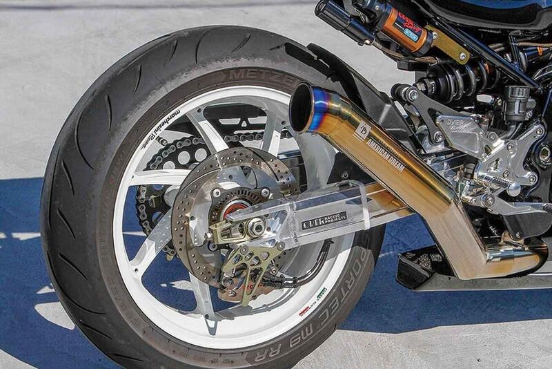 Tocco inconfondibilmente giapponese l'impianto di scarico American Dream dalla finitura iridescente, mentre numerosi sono i pezzi lucidati come le protezioni OVER a lato del motore, le pedane, protezione pignone e così via. In definitiva una special che mantiene, anche nella verniciatura, la propria classe senza scadere nell'eccessivo e mantenendo un filo rosso di congiunzione con le atmosfere degli anni d'oro della serie Z di Kawasaki di cui proprio nel 2022 ricorrono i 50 anni dal debutto.