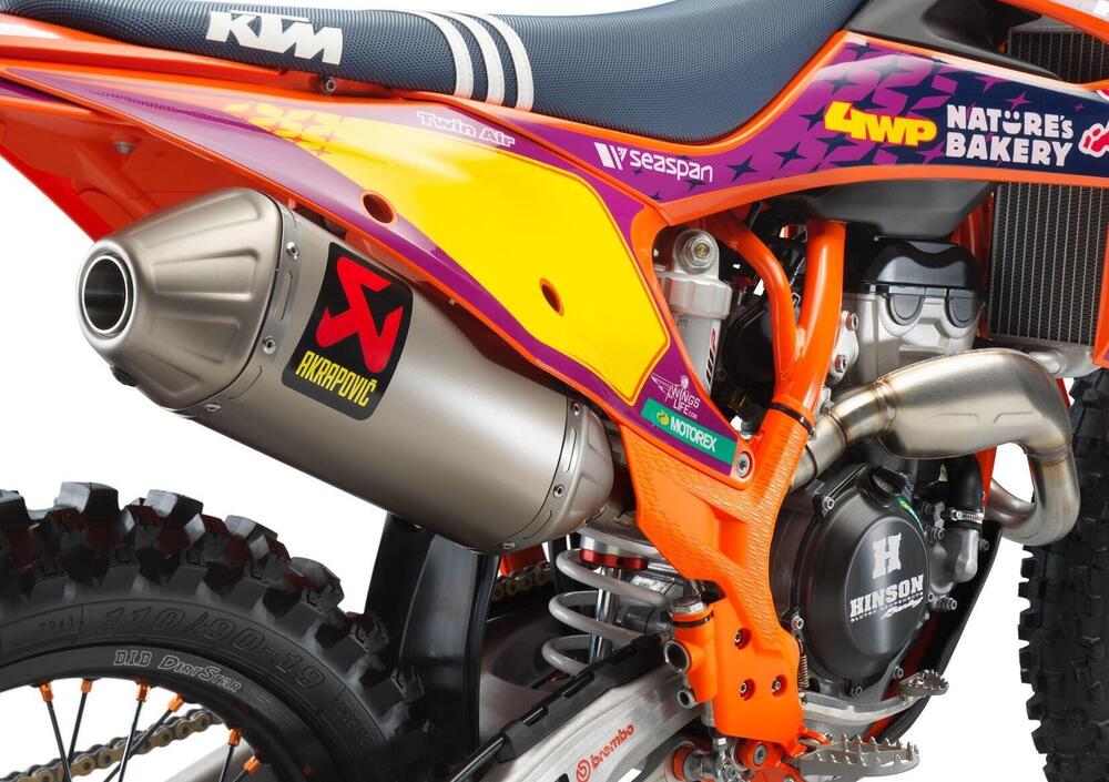 Del modello standard sono confermate le sospensioni (forcella WP XACT ad aria), il telaio e il motore che dà buona mostra di sé anche nella MX2.