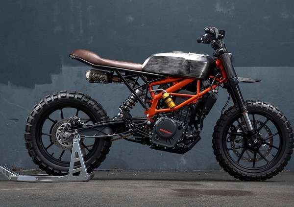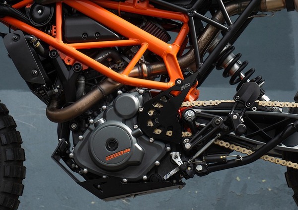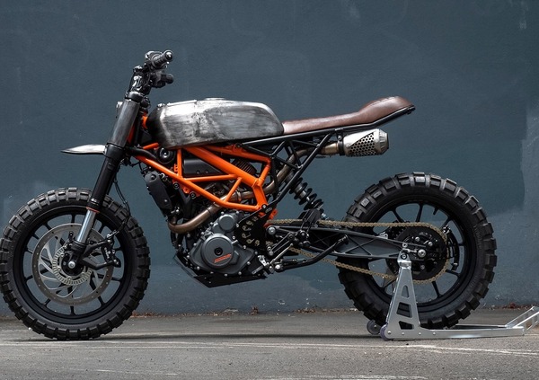 La moto mantiene il tipico telaio a traliccio, e guadagna un'estetica post-apocalittica con la carrozzeria in lamiera a vista, niente verniciatura colorata, solo trasparente, scarico slip on che ricorda quello delle MotoGP e luci anteriori a LED montate su di un cupolino in acciaio. Il filtro dell’aria originale è stato eliminato e sostituito da un K&N molto più compatto che, assieme al nuovo scarico, dovrebbe migliorare le prestazioni della 390.