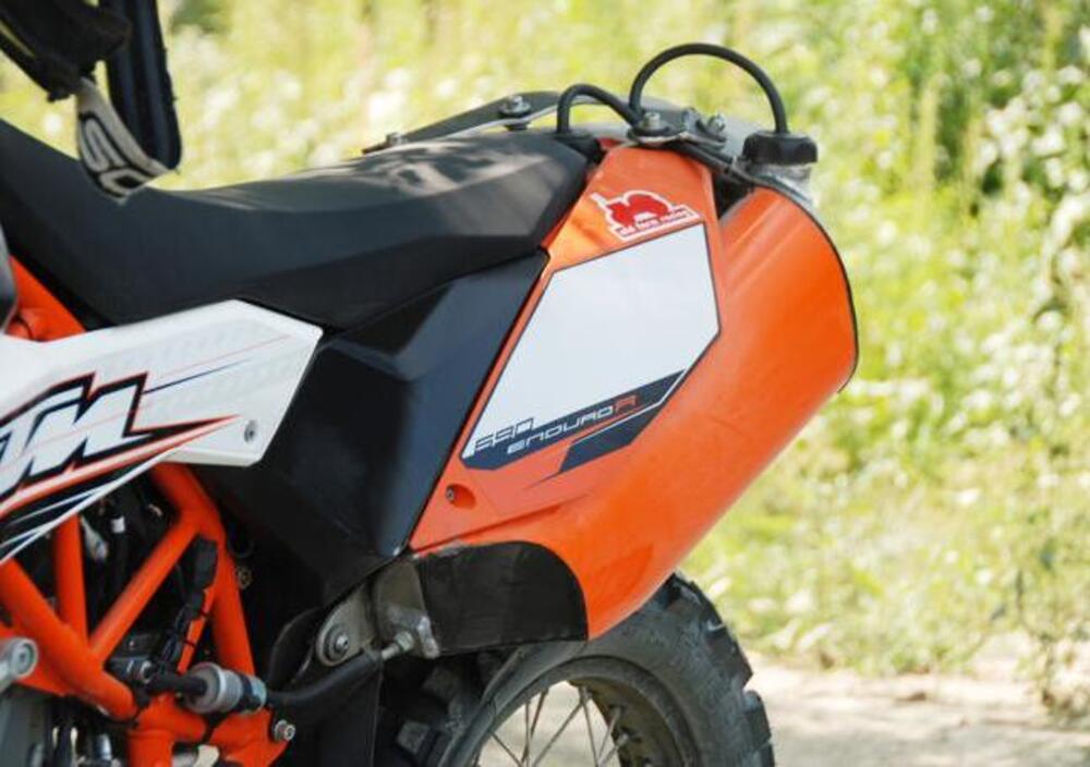 Ho acquistato il modello enduro KTM 690R che con il lavoro degli amici meccanici dell’officina Only Bike di Milano è stato notevolmente trasformato per la gara. E’ stato sostituito il tubo di scarico facendolo passare sotto al motore e utilizzando un silenziatore di più piccole dimensioni, mentre al posto del precedente silenziatore è stato ricavato un serbatoio supplementare di cica 8 litri che non ingombra assolutamente; è stato lasciato il sistema di iniezione con altre mappature che permette un consumo estremamente ridotto di carburante con minor peso. La forcella è stata sostituita con quella del 530 con piastre regolabili ricavate dal pieno e con l’ammortizzatore di sterzo. Anche l’ammortizzatore posteriore è stato allungato per avere maggiore escursione. Per quanto riguarda il raffreddamento il radiatore acqua ha maggiore capienza ed è stato aggiunto un radiatore per l’olio. Una piccola carenatura protegge la strumentazione ed è stato costruito un robusto sottocoppa con i serbatoi per l’acqua e il porta attrezzi. Quanto sopra con varie altre modifiche di dettaglio, ha consentito di contenere il peso totale in ordine di marcia comprensivo di tutti i liquidi in meno di 180 kg (secondo me un risultato davvero notevole) e di avere una moto maneggevole e piacevole da guidare.