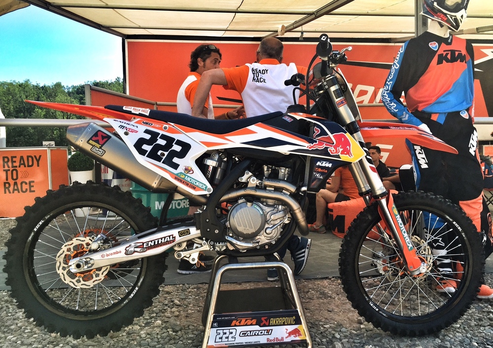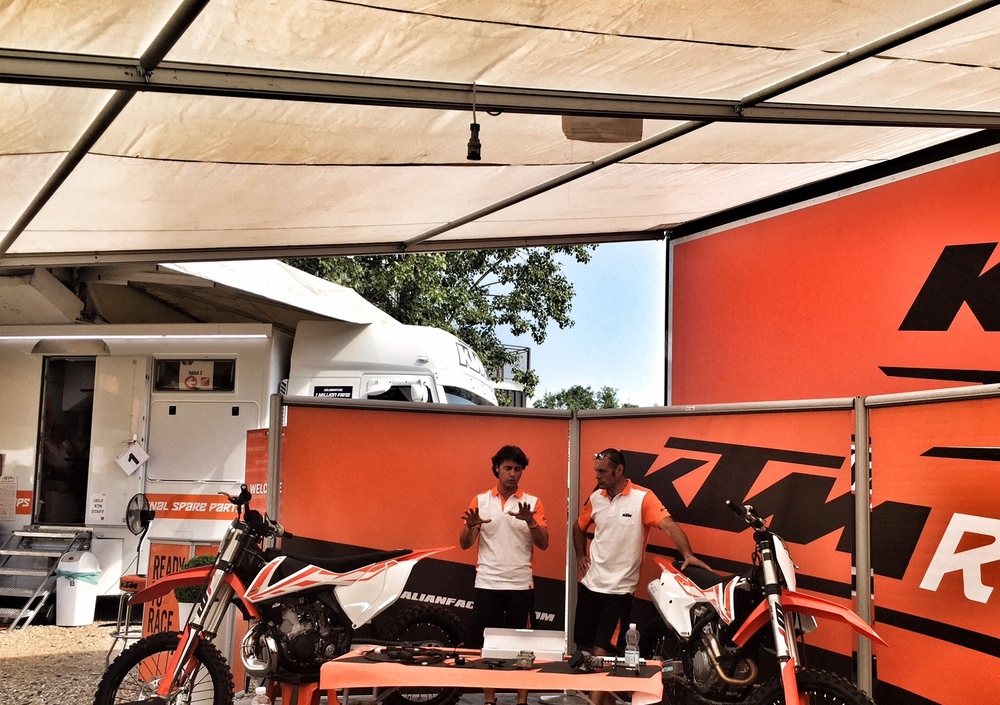 Il nostro Aimone dal Pozzo si trova nel tempio del motocross, a Maggiora, dove tra qualche mese si correrà il Nazioni, per provare le KTM cross 2017 dalla livrea bianca/arancio e ricche di novità. Le sta provando per noi, per raccontarci come vanno, specialmente il 250 a miscela, tutto nuovo, leggero e veloce.