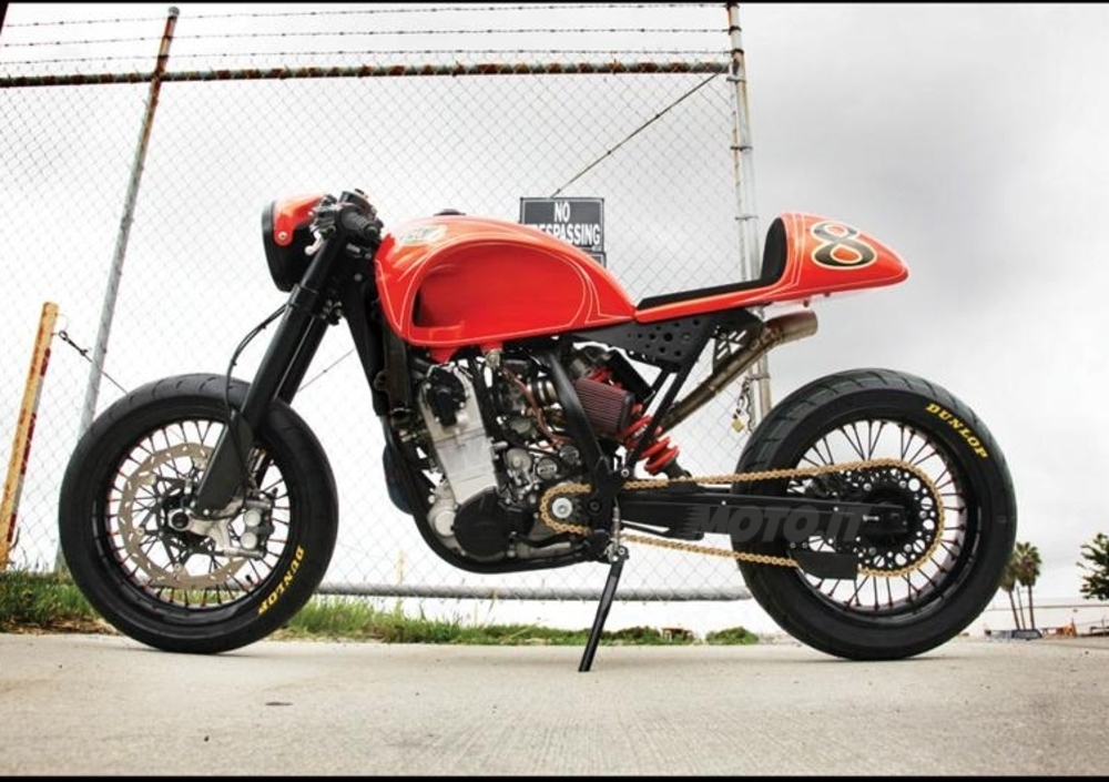 Per il realizzatore di Cafè Racer, Roland Sands Design, la felicità si presenta sotto svariate forme e questa volta si è vestita di un bel arancione californiano. La base di questo nuovo progetto deriva dalla KTM 525 EXC. Quello che immediatamente colpisce è il serbatoio in alluminio realizzato a mano. Anche l’impianto di scarico in titanio è stato completamente ridisegnato. Il risultato è un look decisamente aggressivo.