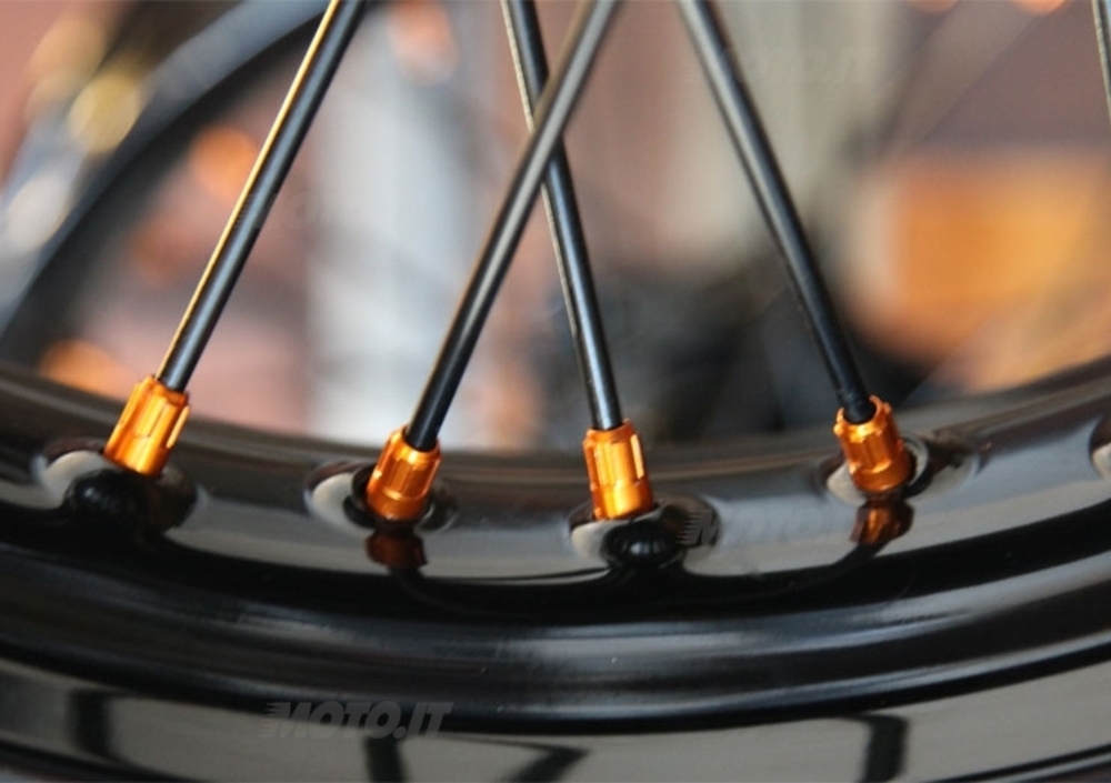 Per quanto riguarda la ciclistica: le forcelle sono state abbassate ulteriormente e il controtelaio è stato pesantemente modificato per far posto alla batteria. Abbassando lo sguardo si nota che le ruote della KTM 525 EXC sono state sostituite da cerchi neri verniciati a polvere e a completare l’opera non potevano mancare dei raggi semilucidi con particolari in alluminio anodizzato Orange Drive. La scelta del colore per dar carattere a questa stupenda Cafè Racer è caduta su un Candy Orange Flake, applicato su serbatoio, codino e copri faro.