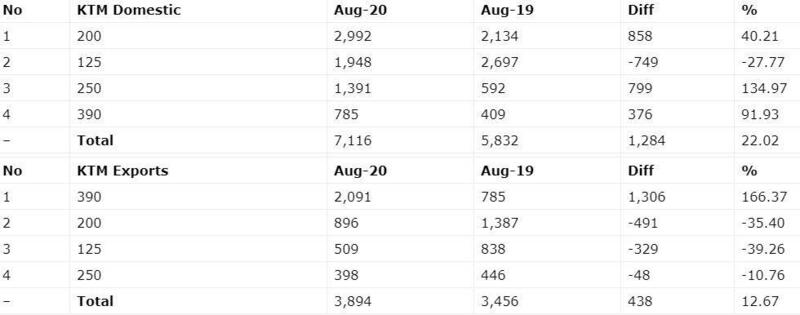 Il segno positivo di agosto si deve alla serie 390, e in particolare alla nuova versione 390 Adventure, con 2.091 unità (il 54% del totale esportato) che ha cisto un aumento del 166% rispetto ad agosto 2019 quando appunto ancora mancava la versione Adventure.