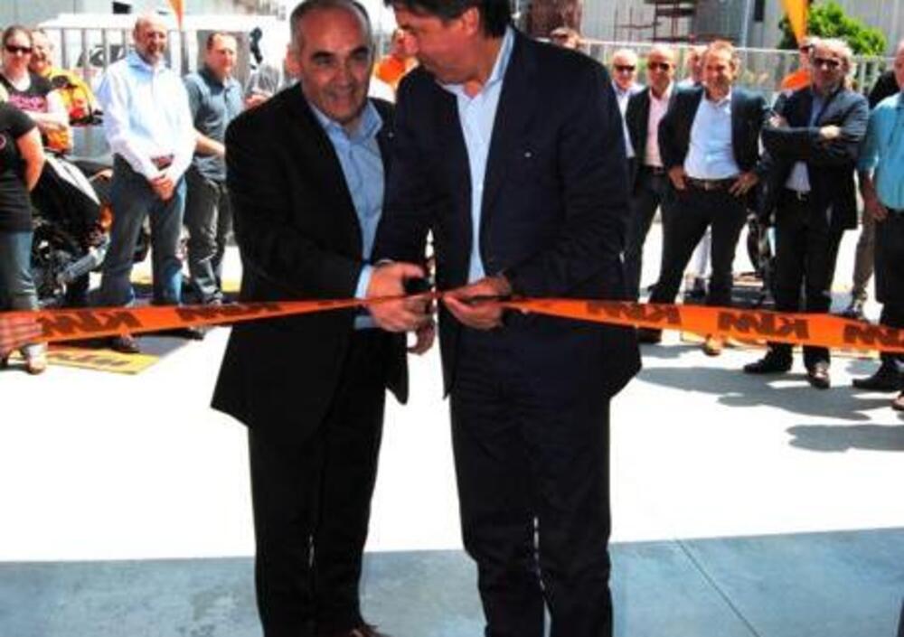 Angelo Crippa (AD di KTM Italia) in presenza di Stefan Pierer (CEO di KTM AG), dei membri del consiglio di amministrazione Viktor Sigl e Hubert Trunkepolz, del responsabile vendite mercati europei Florian Ketch e dello staff della filiale italiana, ha inaugurato la nuova sede di KTM Italia.