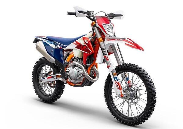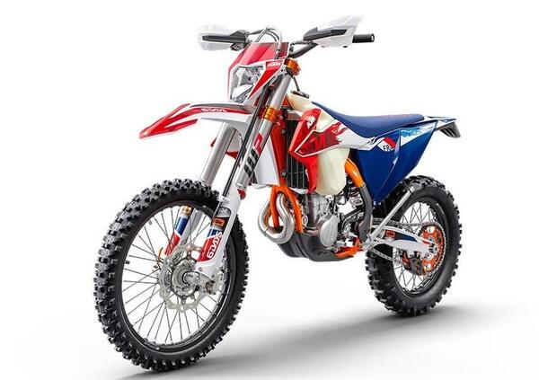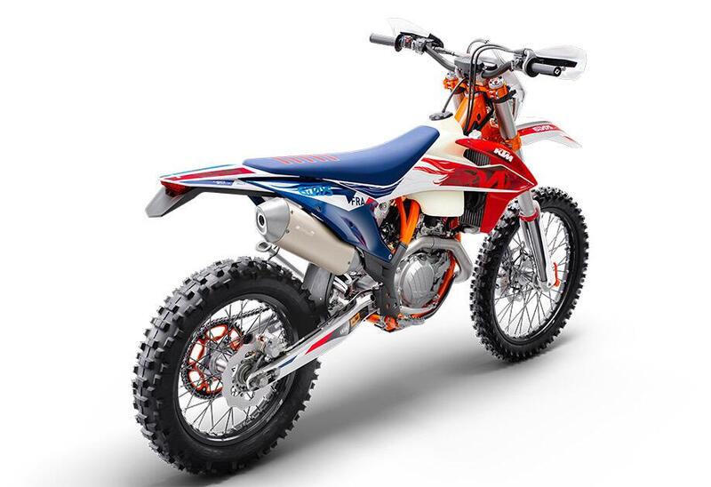 I colori della bandiera francese sono un omaggio alla 96esima edizione della ISDE. Le pellicole di protezione hanno grafiche in mold per resistere più a lungo, il telaio è verniciato in arancione e ha protezioni laterali Factory ad alta resistenza, mentre il telaietto posteriore in profilati di lega di alluminio pesa meno di 900 grammi.