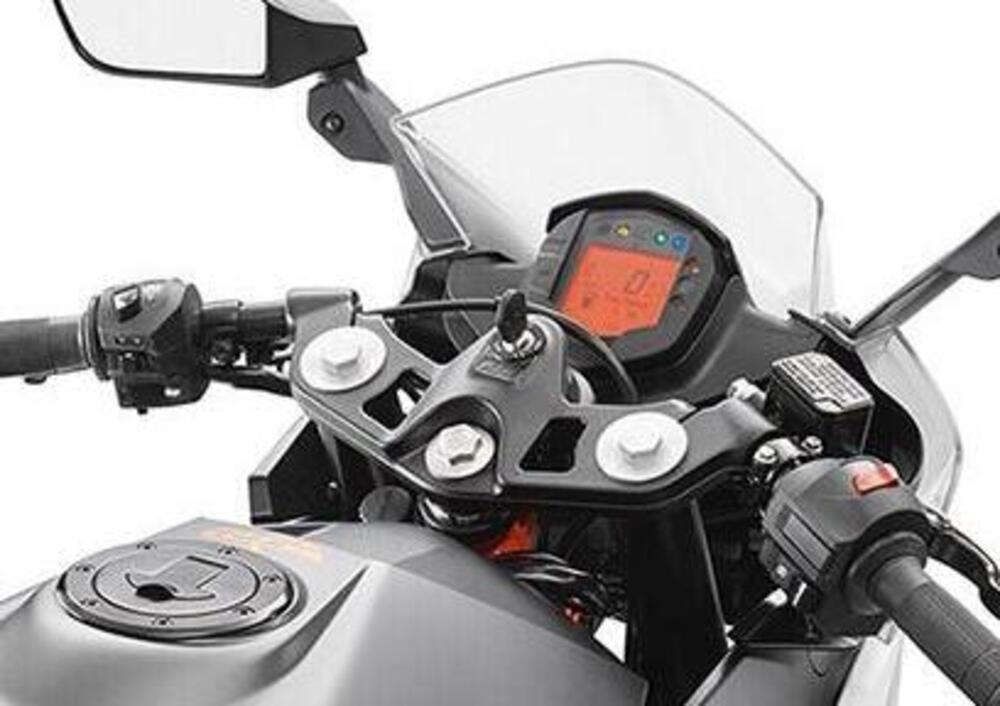 La RC 390 (nelle foto in alkto) è proposta in Metallic Silver, con carenatura in argento metallizzato, telaio e cerchi ruota in arancione.