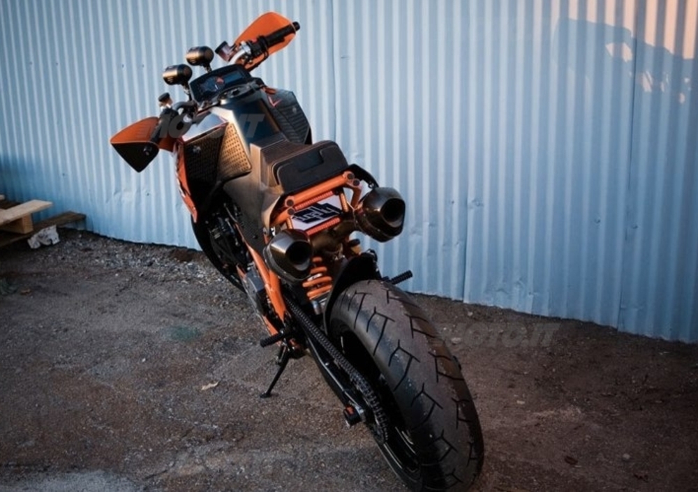 Dal punto di vista estetico, il costruttore si è limitato al minimo indispensabile, togliendo tutto ciò che poteva risultare superfluo. Via dal cupolno il faro, sostituito da due faretti appositamente agganciati al manubrio, il cruscotto, posizionato sopra il serbatoio grazie ad un supporto realizzato in fibra di carbonio, la sella, sostituita a sua volta con una “speciale” in gomma, via il codino e i classici scarichi racing sono stati accorciati giusto quel minimo per garantire un sound di tutto rispetto.