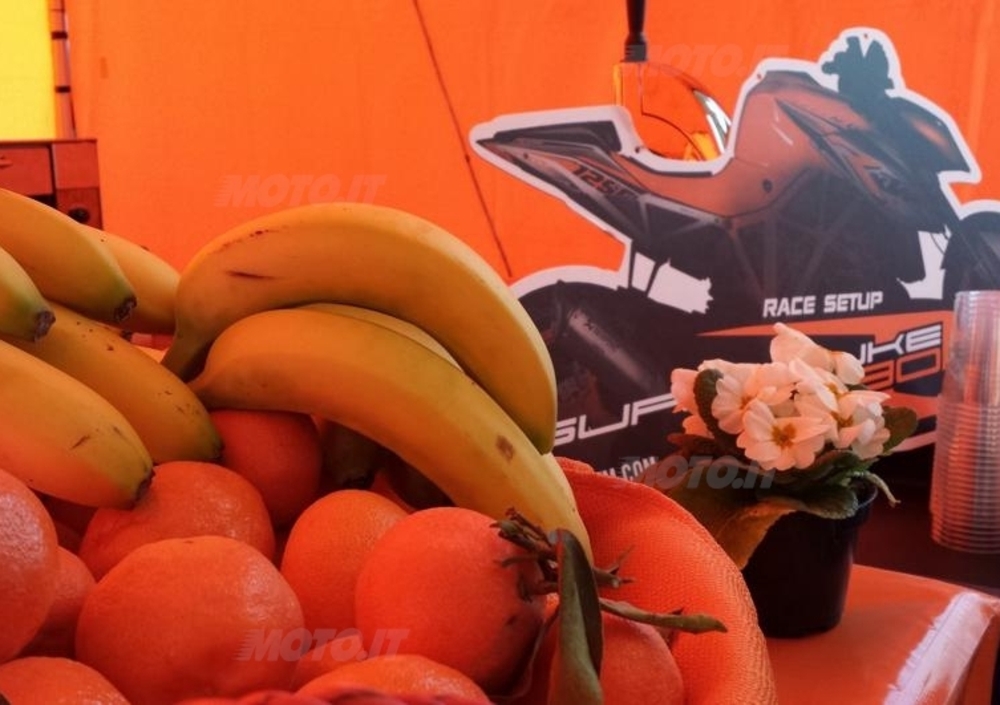 Il sabato, dicevamo, la perturbazione Artemide ha parzialmente guastato la festa, con cielo plumbeo, qualche scroscio di pioggia e temperature ben diverse da quelle ampiamente primaverili che avevano graziato la giornata di venerdì. I partecipanti non si sono fatti intimorire, tirando fuori il meglio dalla giornata sia in pista che nei test ride stradali. KTM non ha fatto mancare a nessuno un caffé caldo, una bibita fresca (a seconda delle esigenze) e un boccone fra il box dedicato alla reception e la propria Hospitality, che a fine giornata ha "aperto i cancelli" a tutti.